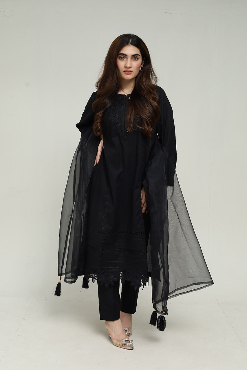 Embrace timeless sophistication with Midnight Charm from Gendure’s Intermix SS’25 Collection. This classic black embroidered 3-piece redefines evening elegance, making it your go-to choice for formal dinners, festive occasions, and semi-formal gatherings. Designed in premium breathable lawn with refined detailing, it offers a sleek silhouette, graceful drape, and unmatched versatility.