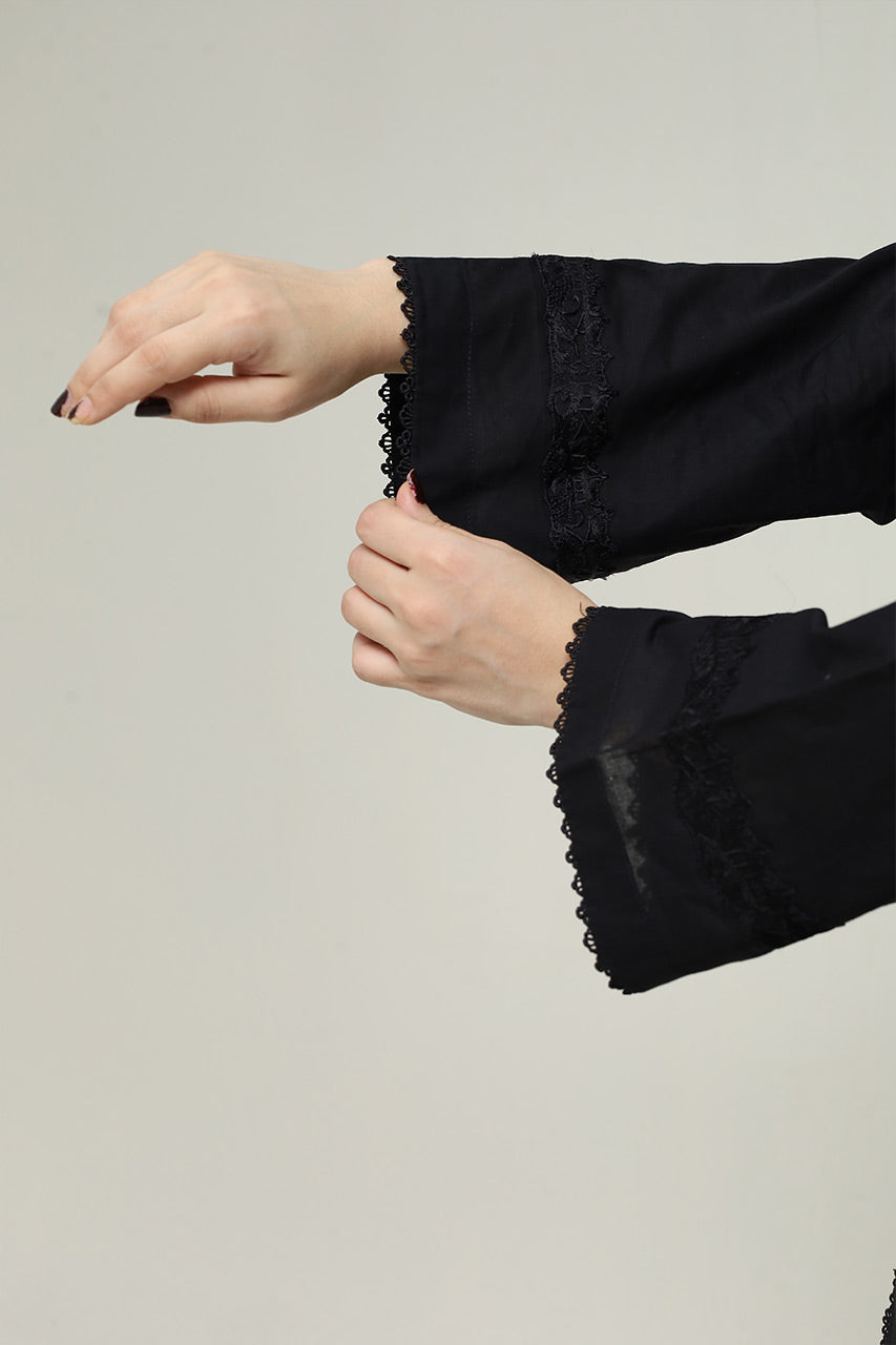 Shirt: Jet-black embroidered lawn kurta with lace & bead detailing on neckline and sleeves