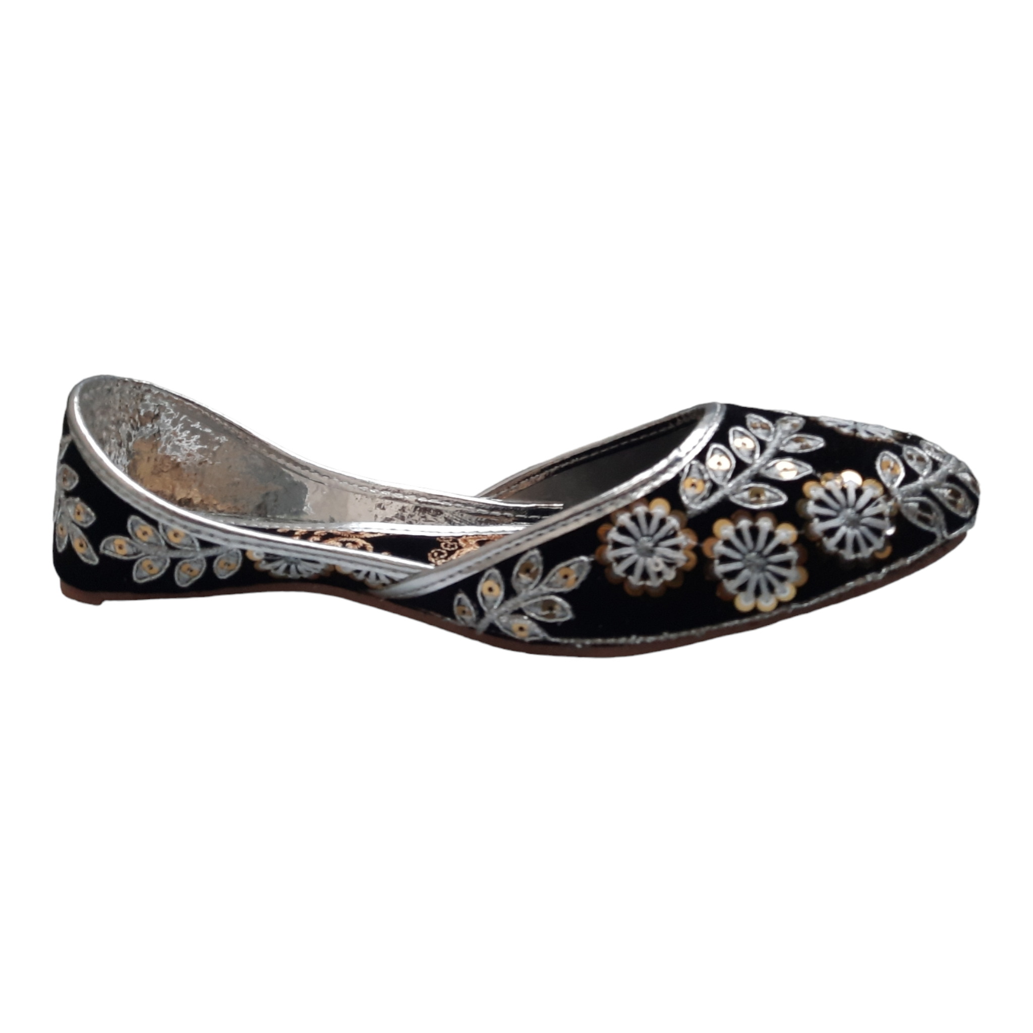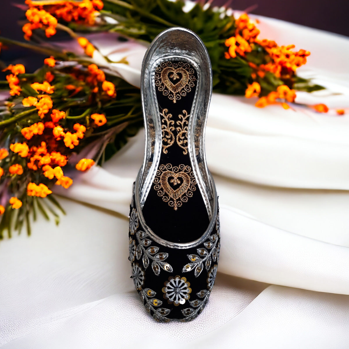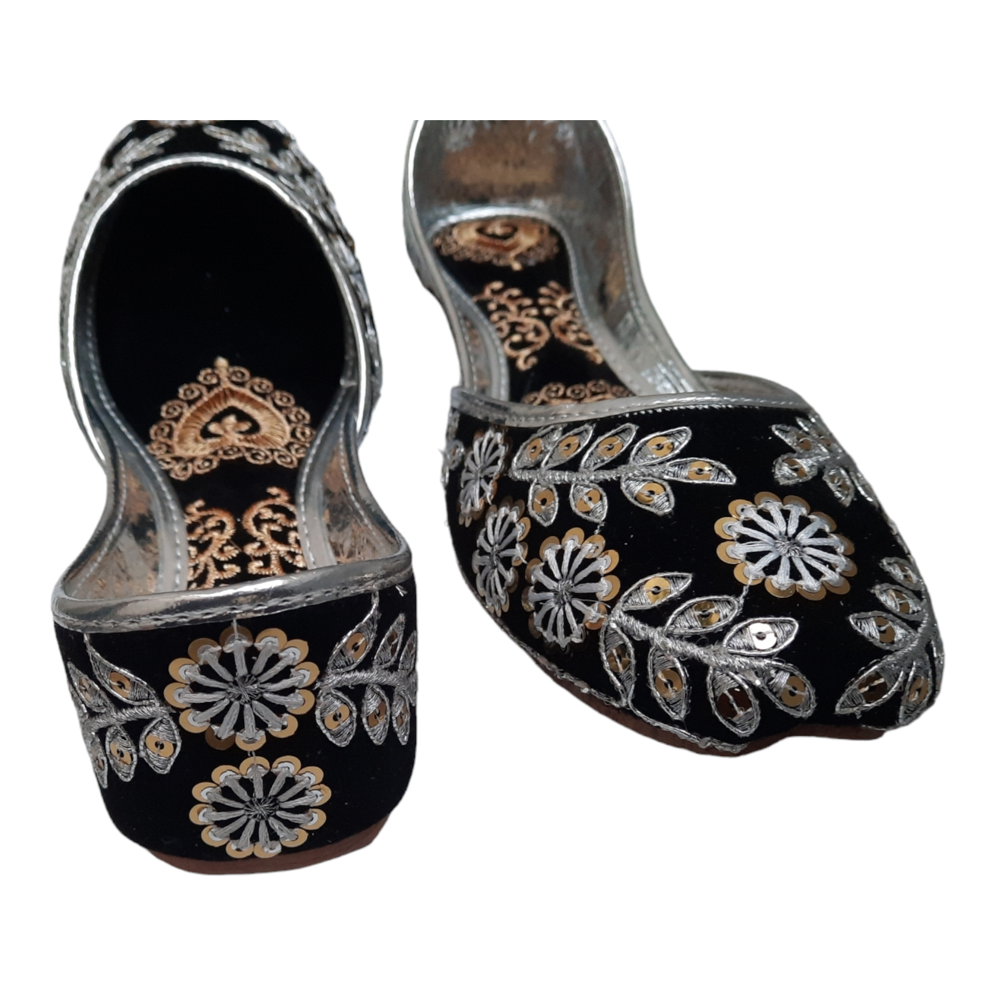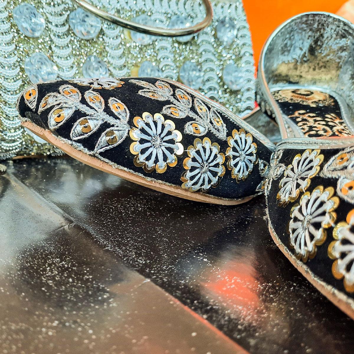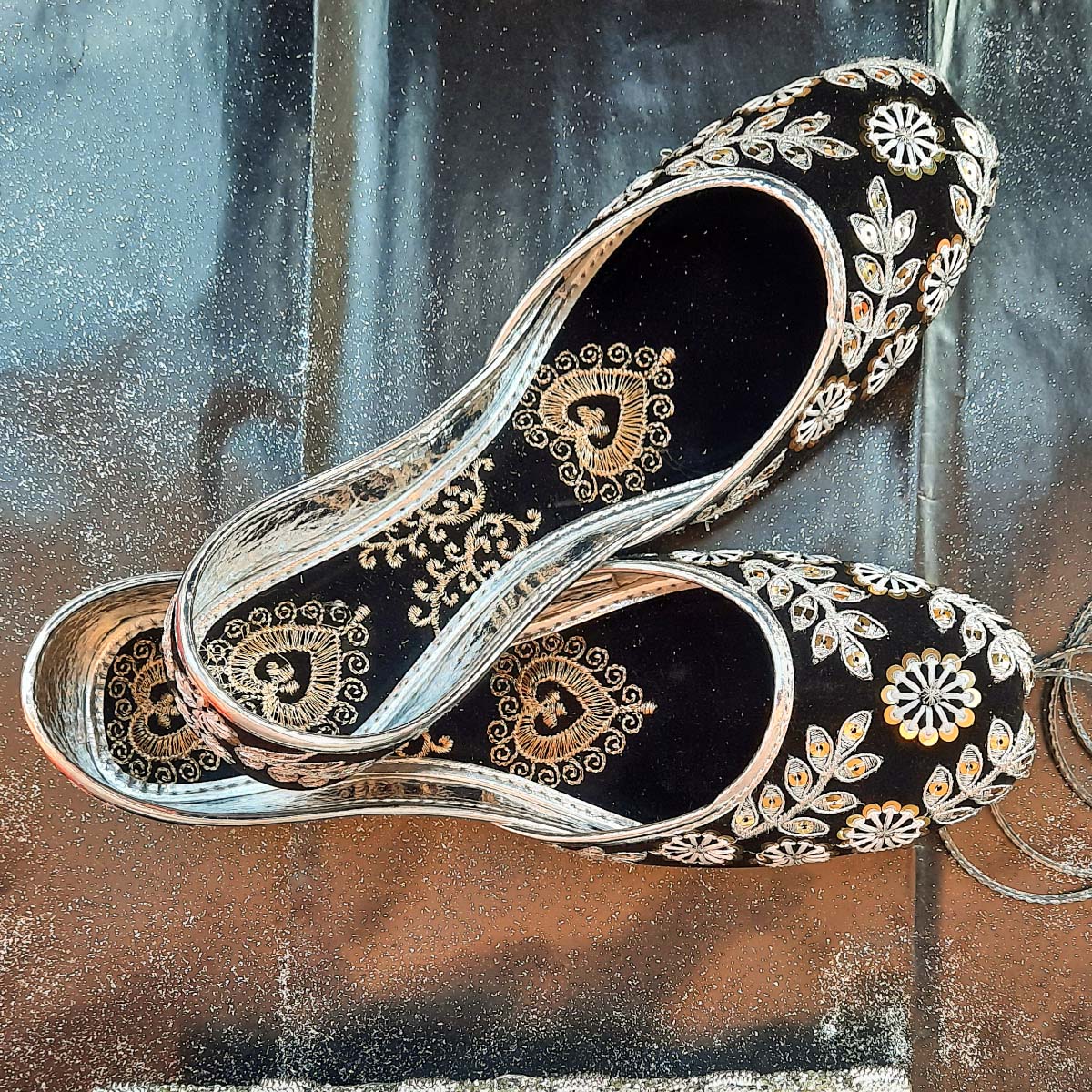 Unleash your daring side with our exquisite Black Embroidery Khussa. Featuring elegant silver embroidery on a sleek black design, these shoes provide both style and comfort. With soft inner padding, they are perfect for those seeking royalty in their look. A must-have for any wardrobe!
