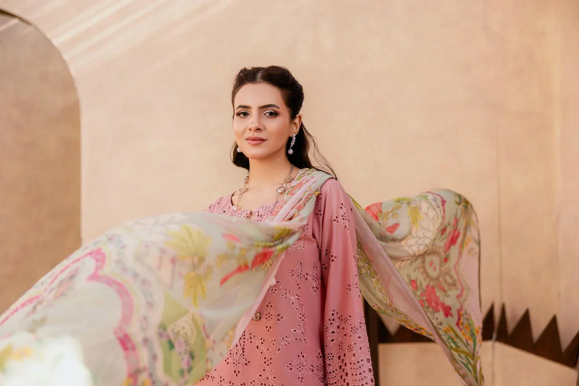Soft, graceful, and effortlessly feminine — our Pink Petal Bloom suit is a dreamy addition to your Summer 2025 lawn collection. This stitched 3-piece embroidered lawn suit features intricate eyelet-style embroidery and cutwork lace details that add depth and elegance to every stitch. Paired with a digitally printed dupatta blooming in floral hues, this ensemble is perfect for daytime celebrations, brunches, or summer gatherings.