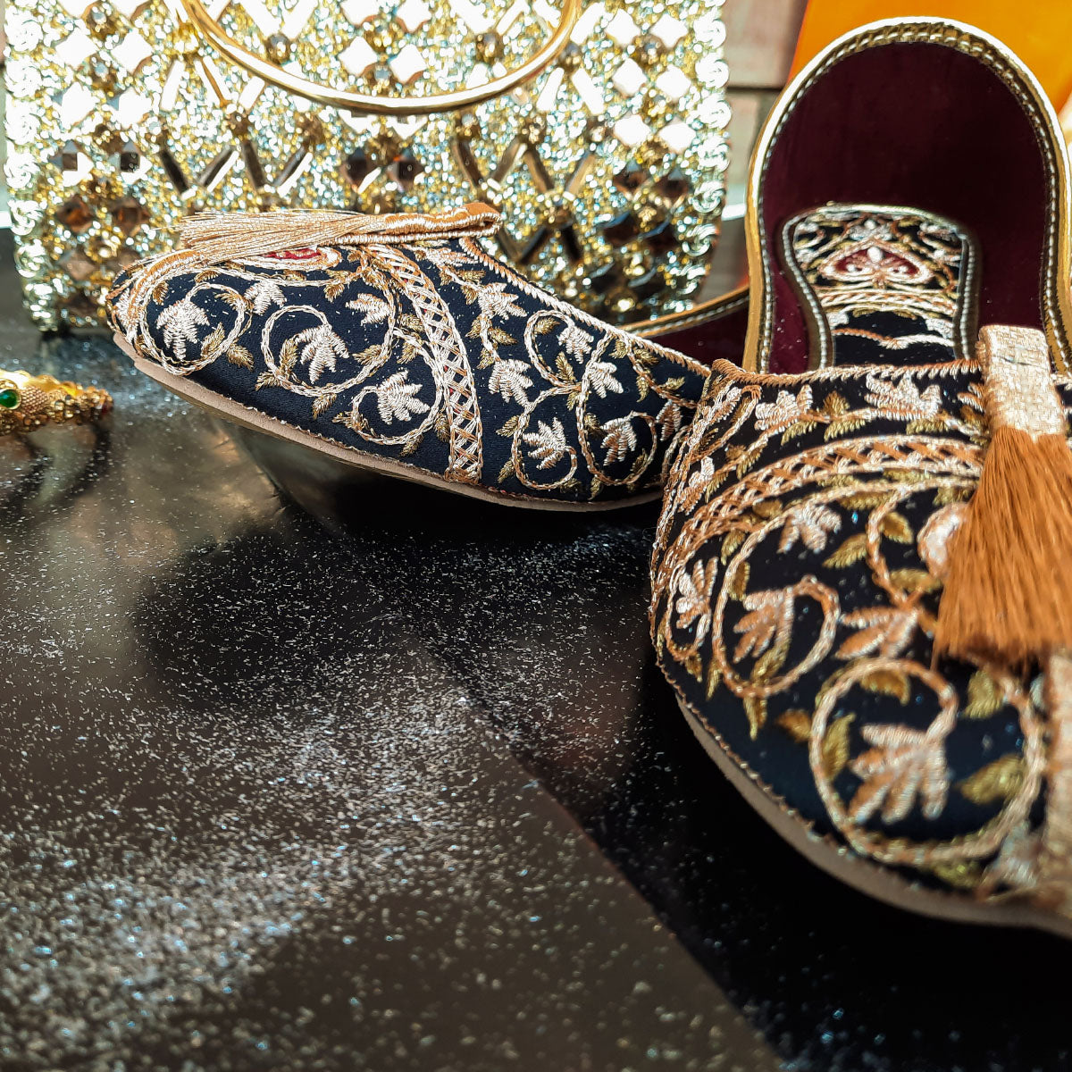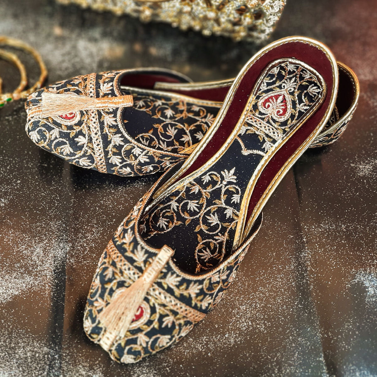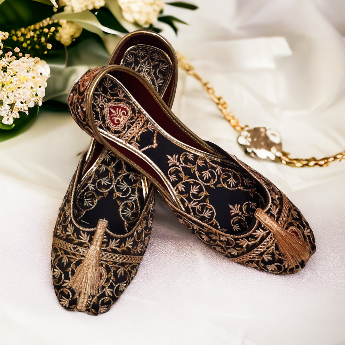 Introducing Arusak, the perfect blend of style and comfort. Our Black Embroidery Khussa features a soft and padded interior, complemented by a gorgeous golden embroidered design. The sleek black color and full embroidery add a touch of elegance to any outfit. Elevate your footwear game with Arusak - versatility and luxury in one!