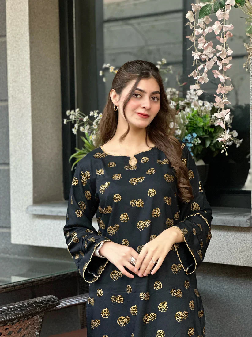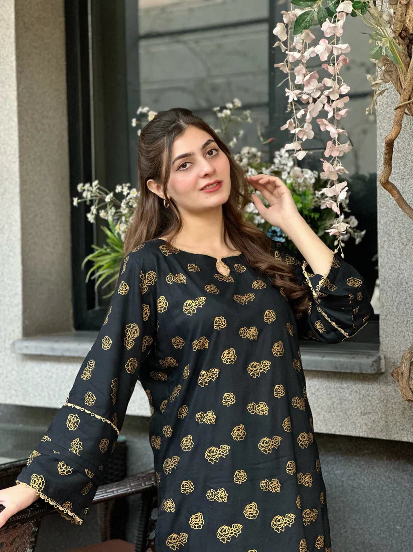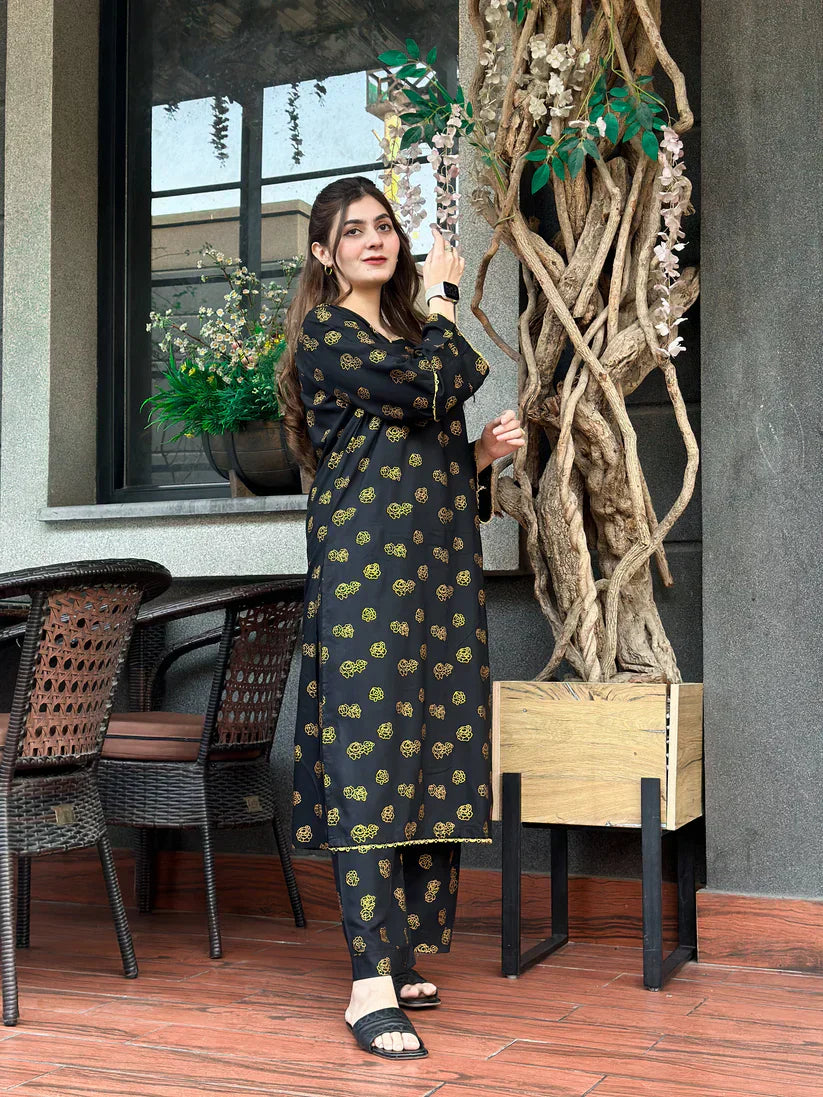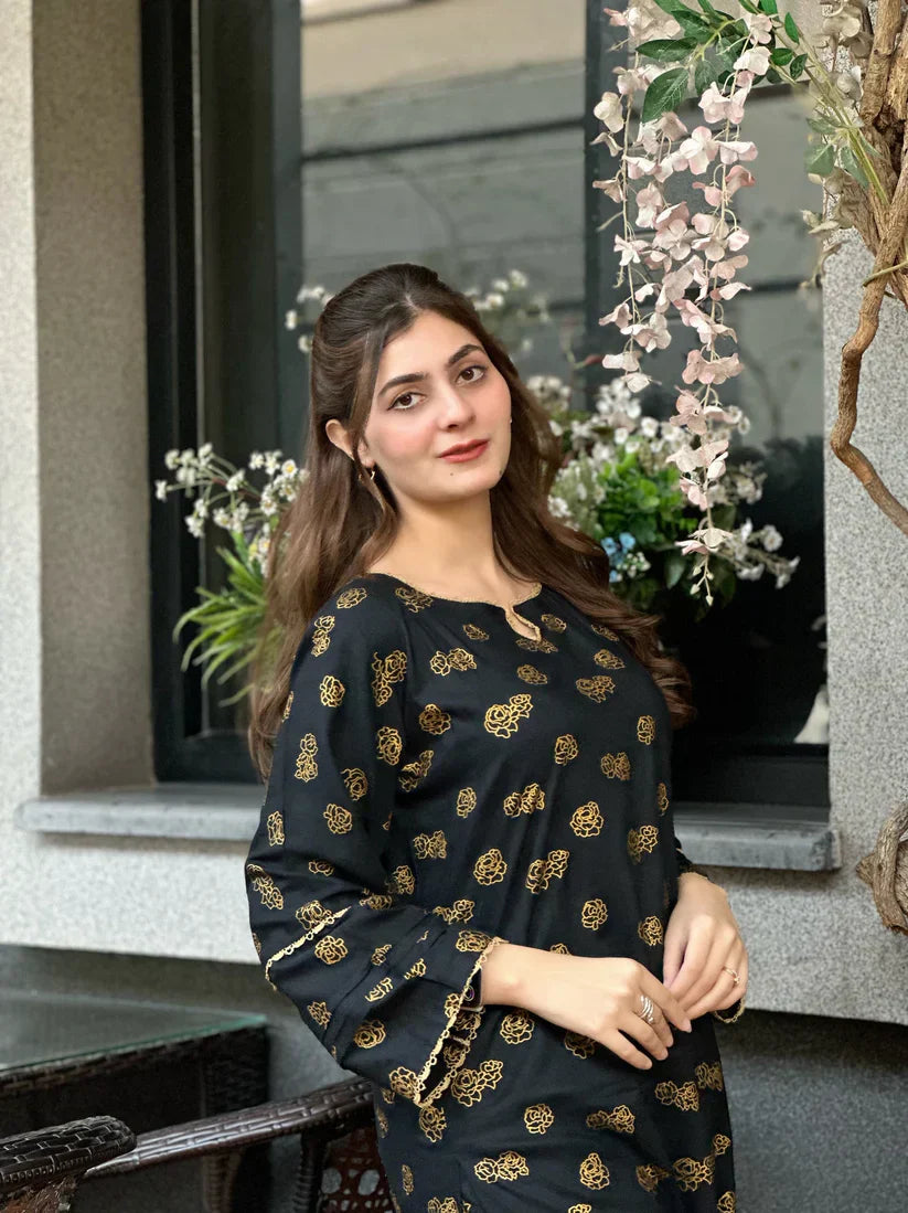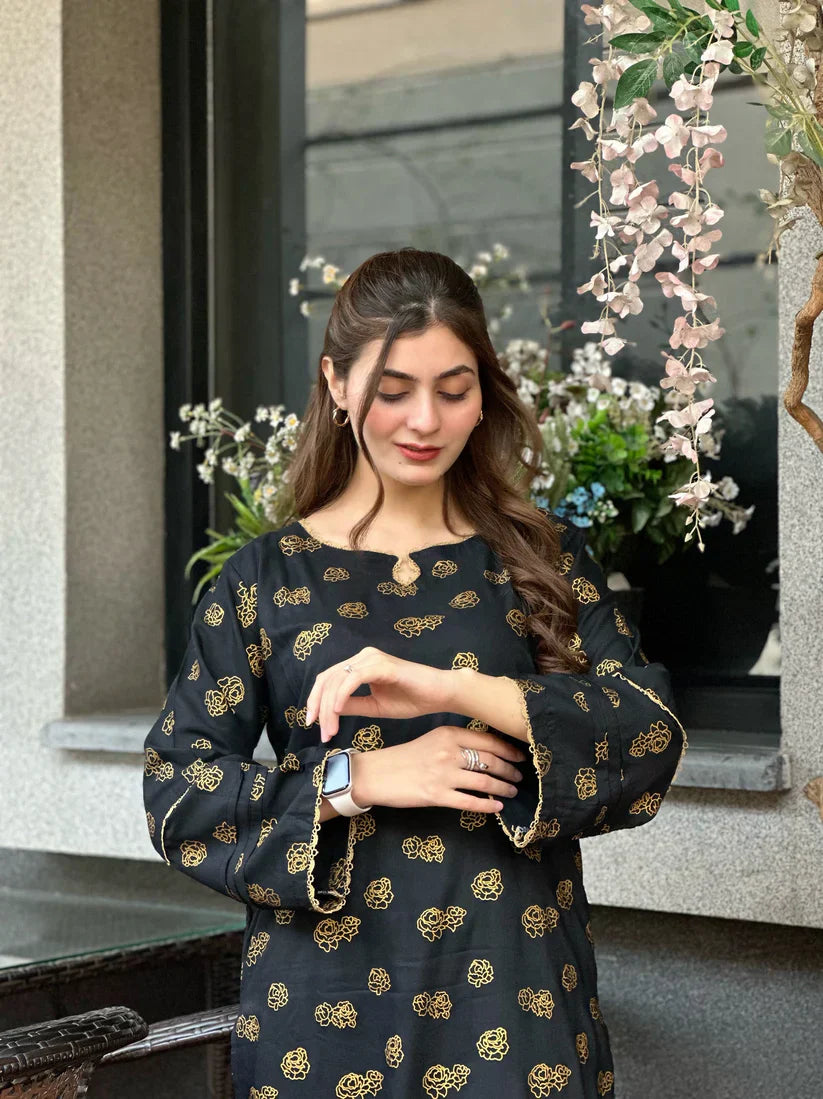 Step into effortless sophistication with Noir Zarqa – a striking black and gold printed outfit designed to leave a lasting impression. Made from premium Arabic Lawn, this 2-piece stitched suit offers a graceful balance of tradition and trend, perfect for festive evenings, casual outings, or special gatherings.