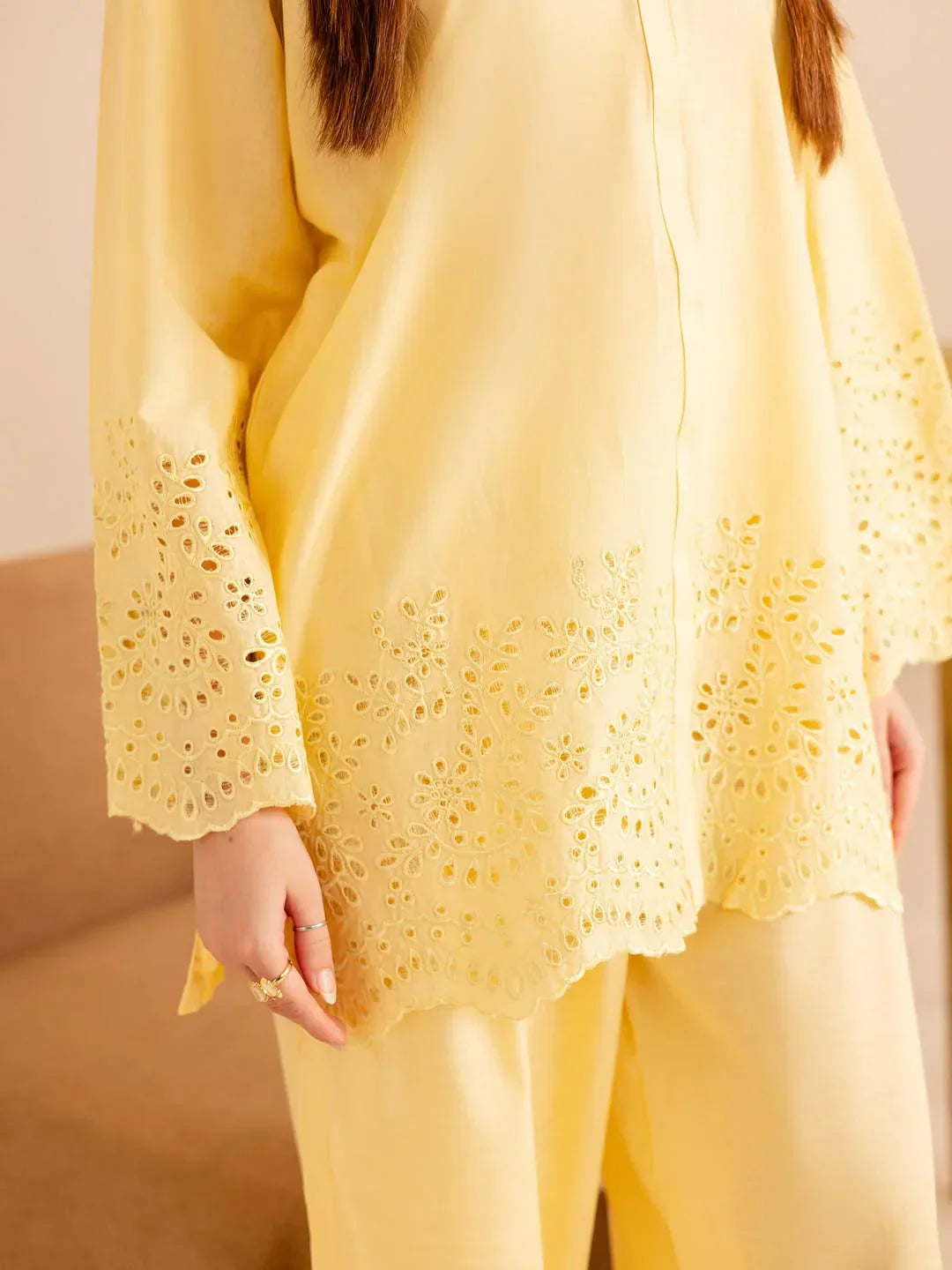 Style: Straight-fit with Chikankari embroidered edges for a graceful finish